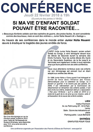 Excellent orateur, Junior sait toucher les jeunes comme les adultes quelque soit l’âge et l’origine de son auditoire. Ses interventions en Français ou Anglais ont pour but de sensibiliser et d’expliquer le drame que vivent encore aujourd’hui les enfants soldats, orphelins et victimes de guerre.